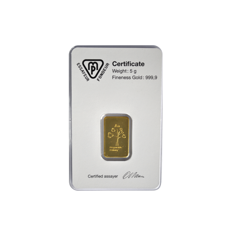 Les lingotins en or de 5 grammes sont des produits neufs d'une pureté de 999 millièmes (or fin 24 carats). Les dimensions du lingot d'or 5g sont 23 mm (longueur) x 14 (largeur) x 1 mm (épaisseur). Son petit format, idéal pour le stockage et la revente notamment, en fait un produit parfait auprès des primo-investisseurs.