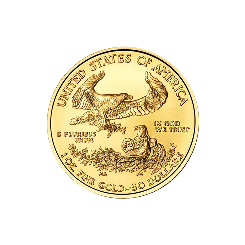 La titulature visible en haut de la pièce rappelle le pays d'émission : « UNITED STATES OF AMERICA ». De chaque côté du nid, on peut lire « 1 OZ FINE GOLD - 50 DOLLARS » et « E PLURIBUS UNUM (…) IN GOD WE TRUST ».