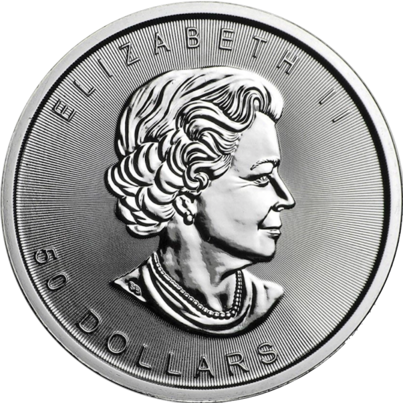 Sur le revers de la Maple Leaf 1 once figure le portrait de la reine Elisabeth II qui a été modifié deux fois en 1989 et 2003 pour pouvoir la représenter à des âges différents. On y retrouve aussi la valeur nominale de 50 Dollars CAD ainsi que l'année d'émission.